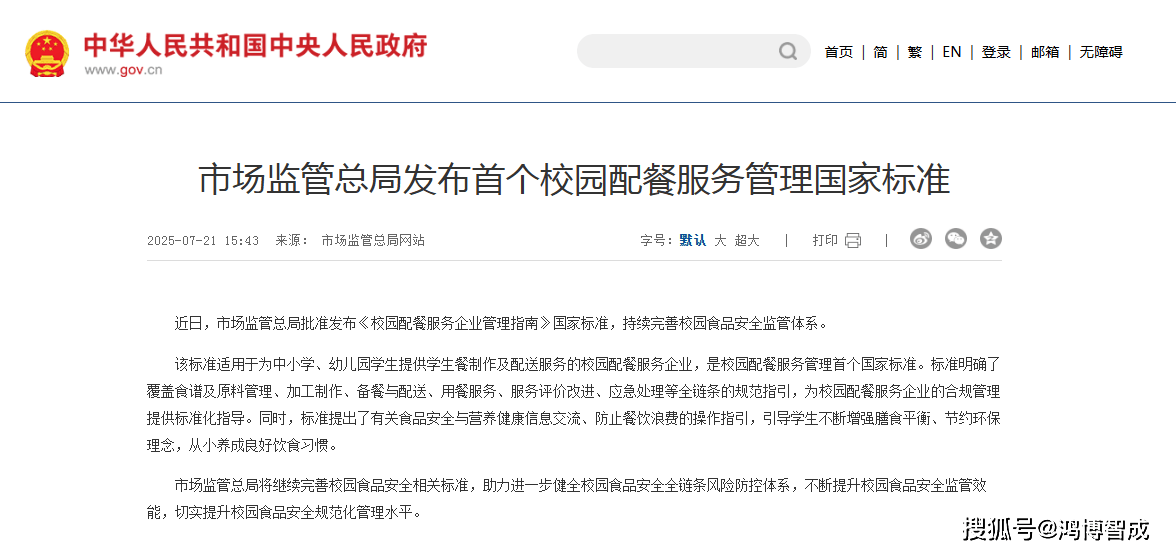 国度首个特地针对校园配餐的国度尺度——《校园配餐办事企业办理指南》于2025年12月1日正式实施。